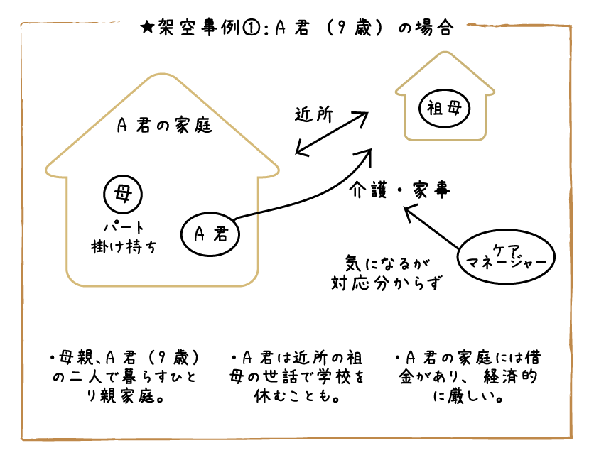 | ケアマネージャーとも連携し、 高齢者福祉の観点やひとり親家庭への支援の観点から相談・コーディネーションを実施 →家事代行・家事援助等の利用可能な資源の確保・拡充 →A君の家事負担の軽減 |